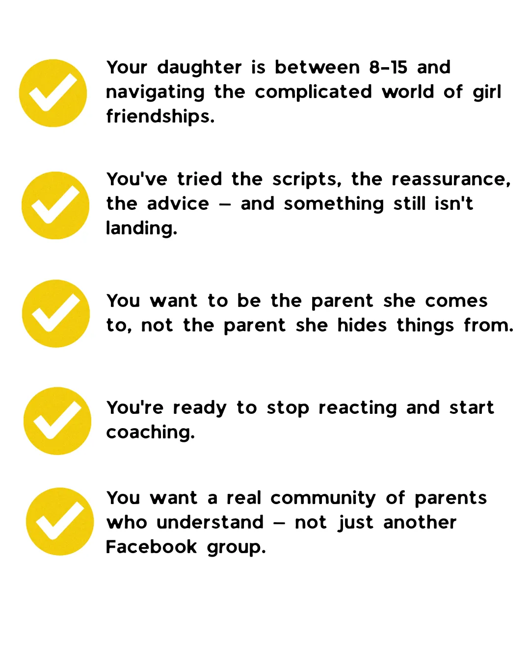 Because mean girl culture doesn't disappear after 8 weeks. Your $99/month membership keeps you connected to ongoing coaching, new skill content, the full community, and support as new situations arise.
